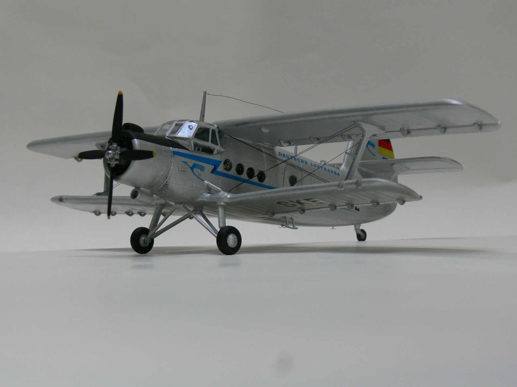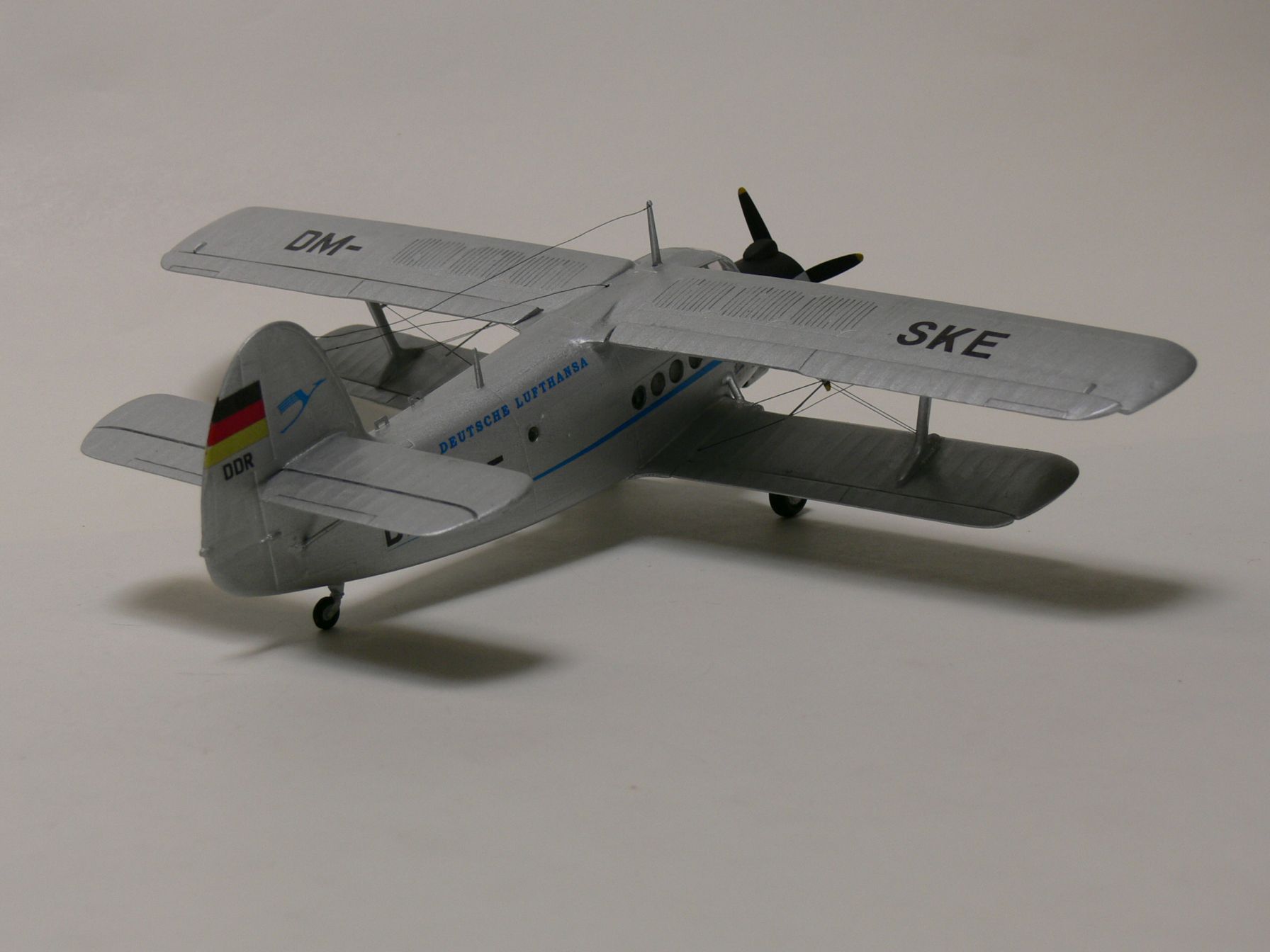 Unser Modell zeigt eine Passagierversion des Mehrzweckflugzeuges in der Kennung der Lufthansa der DDR, bevor diese zur „Interflug“ umfirmierte. Als STOL-fähiger Typ war die An 2 für den Einsatz auf Nebenstrecken und als Zubringer prädestiniert. Ihre Robustheit ließ Start, Landung und Wartung auch auf Flugplätzen zweiter und dritter Ordnung zu.