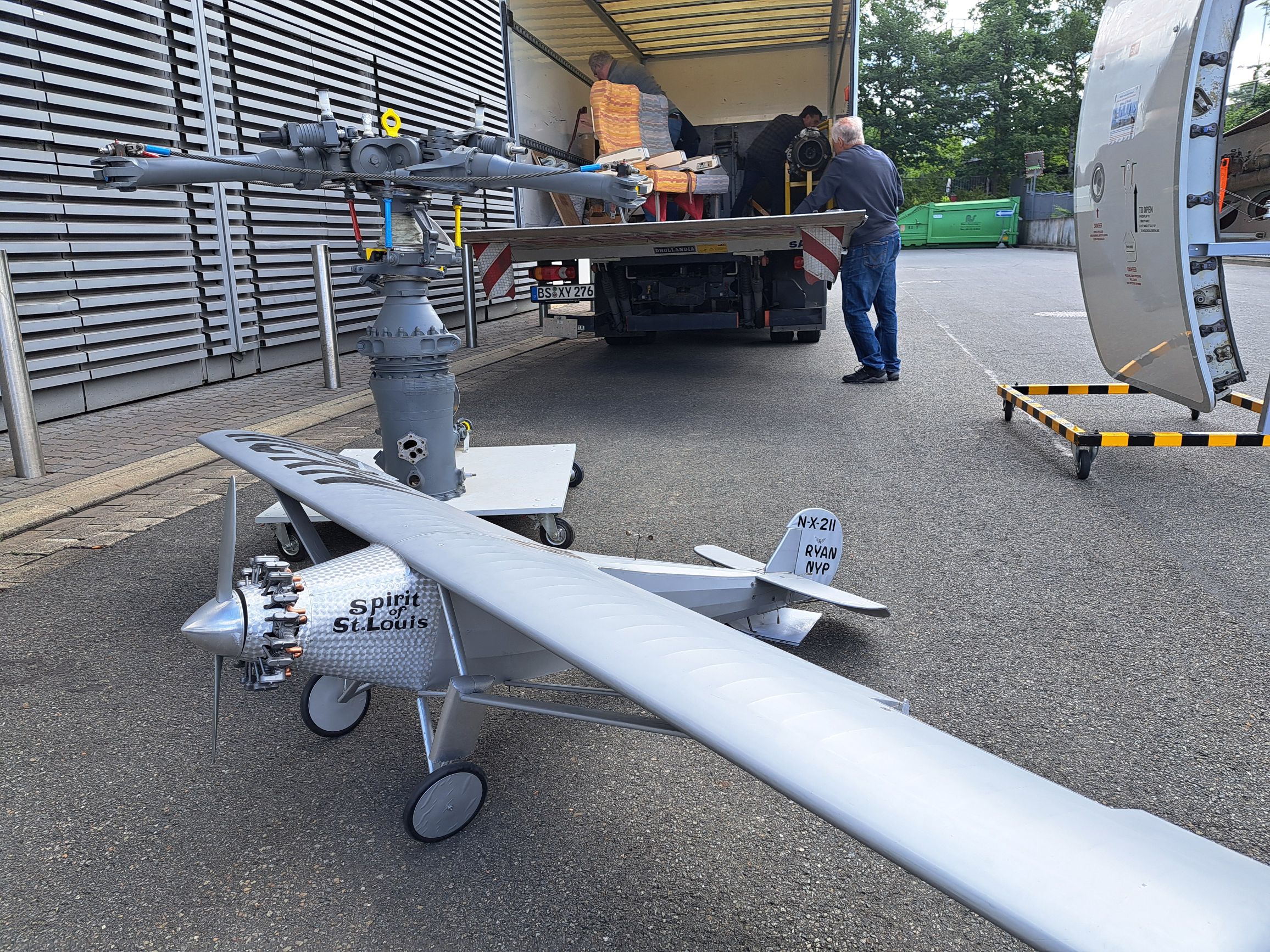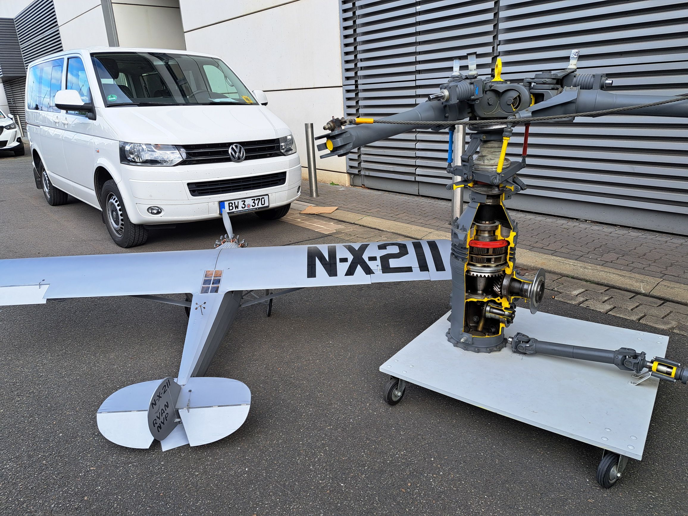 Warner-Scarab Sternmotor, Plantengetriebe und Rotorkopf eines Alouette-Hubschraubers, Propellerblatt einer DC-3/C-47, RW-3 Multiplan-Flugzeug, ein Modell des Atlantikfliegers Spirit of St. Louis und den berühmten Martin-Baker-Schleudersitz.
